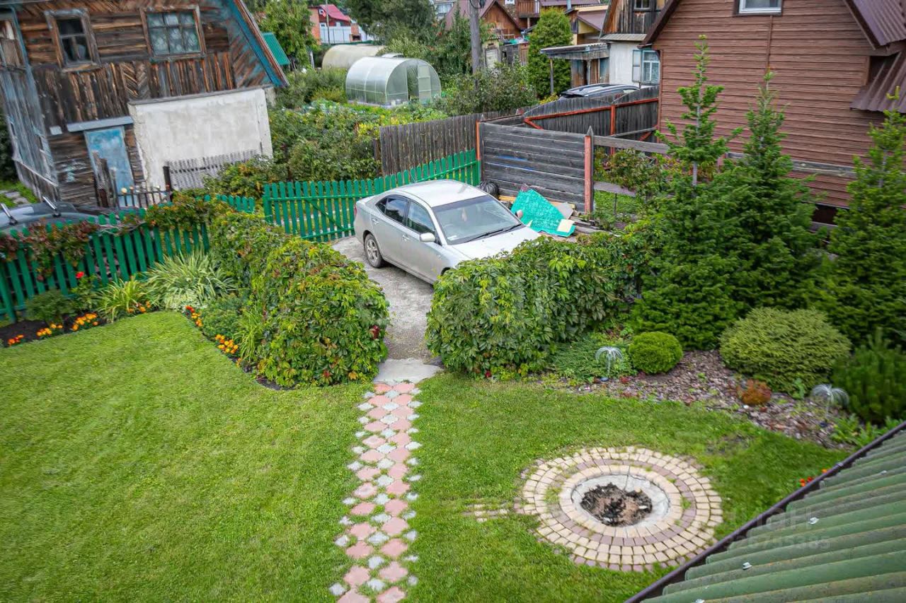 На участке растут разнообразные растения: - Ягоды (малина, жимолость), - Цветы (гортензии, пионы...), - Украшают пространство хвойные деревья, - Парковочная зона под две машины.