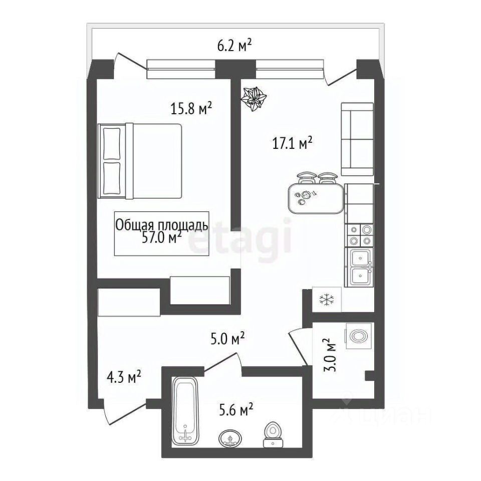 Просторный, не проходной холл(4,3м).Не будет грязи по всей квартире. Большой сан/узел(5,6) и отдельная прачечная или кладовая. Просторная спальня(15.8м) со своим выходом на террасу(6,2м). Кухня-гостиная(17,1м), в которой удачно встанет вся необходимая мебель, также со своим выходом на террасу. Каждый метр квартиры использован функционально, поэтому такие планировки быстро выкупают. Площадь указана с учетом лоджии.