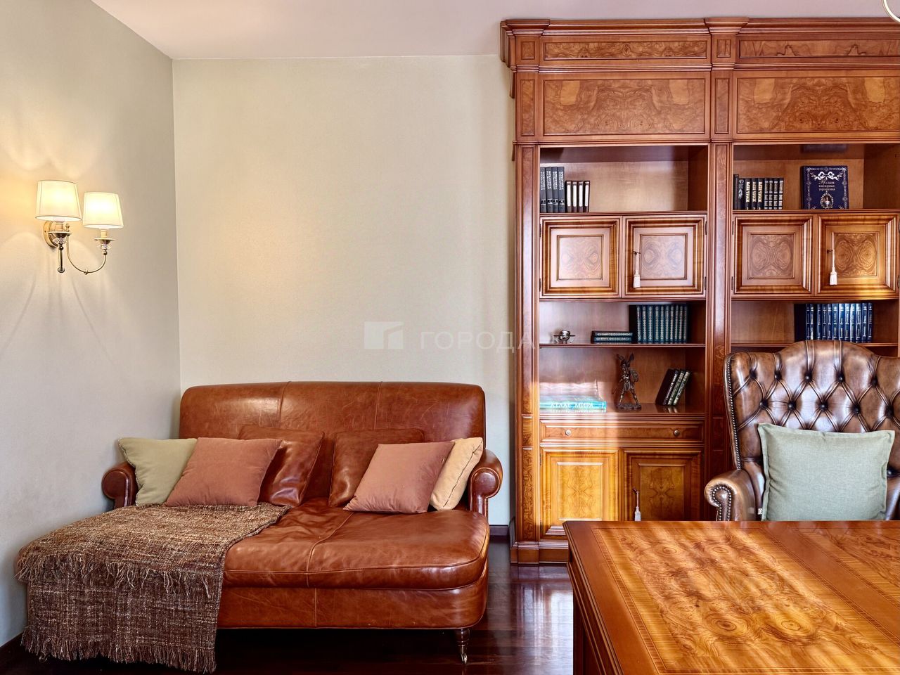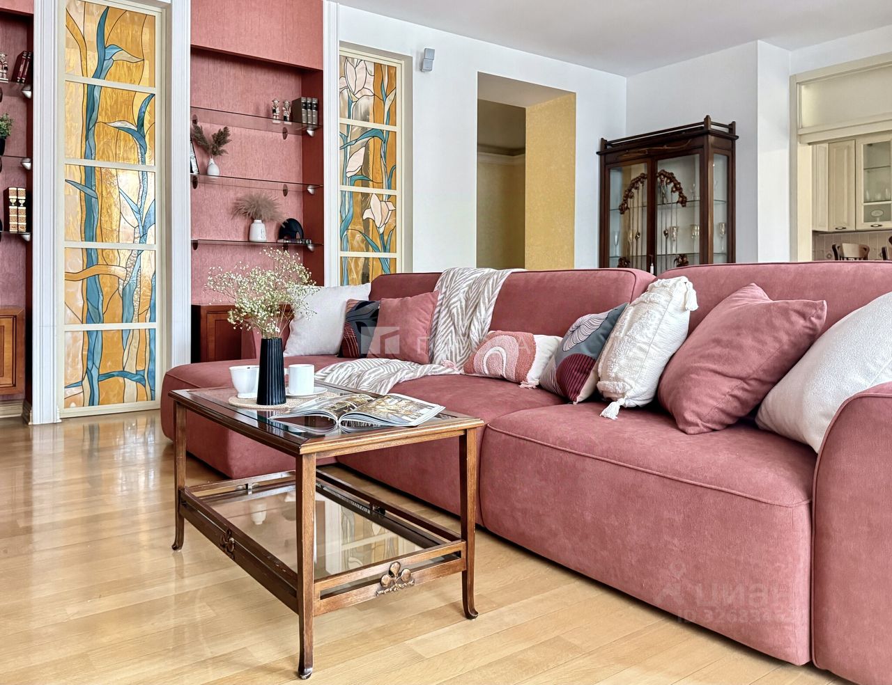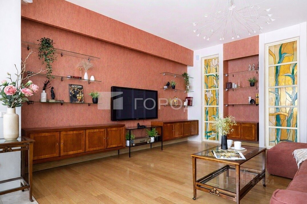 Интерьер Дизайн квартиры выполнен в стиле модерн, со вниманием к пропорциям, материалам и деталям. • эксклюзивная мебель из натурального дерева, • авторские витражи, • благородная, тёплая цветовая палитра, • многоуровневое освещение, формирующее разные сценарии жизни — от яркого дневного до мягкого вечернего. Интерьер вне времени — качественный, выверенный и гармоничный, создающий ощущение уюта, статуса и спокойствия.