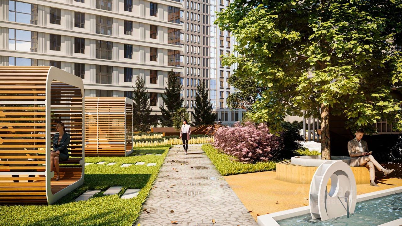 Внутренний двор спроектирован как многофункциональное общественное пространство для отдыха, работы и активного досуга жителей всех возрастов: релакс-зоны у ручья, спортивные площадки, памп-трек и открытый амфитеатр. Входные группы выполнены в статусном, современном стиле с авторскими декоративными панно ручной работы и цветовыми решениями, перекликающимися с архитектурой фасадов.