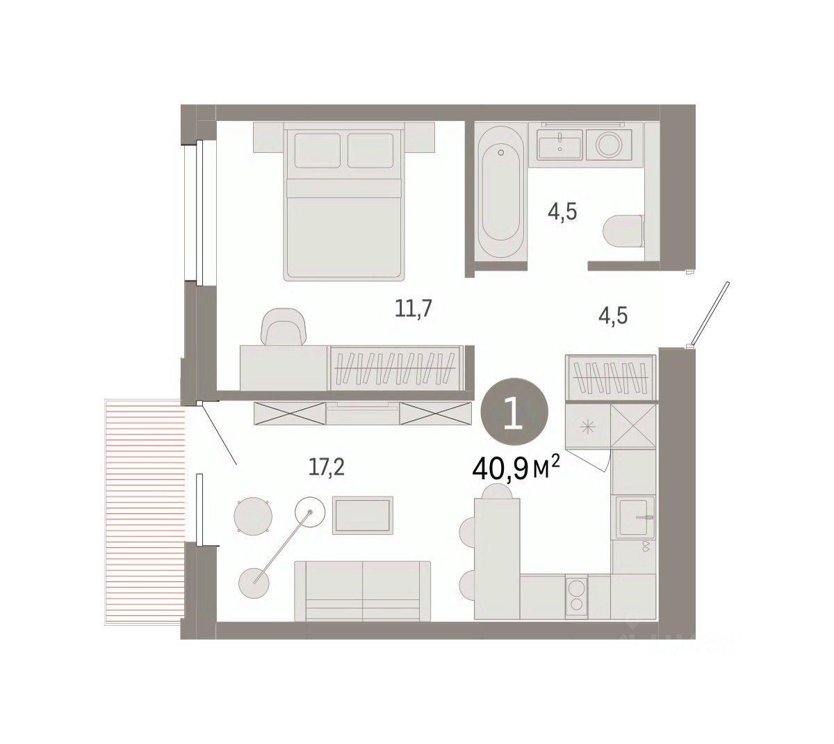 Квартира с кухней-гостиной и одной спальней в проекте Город-на-озере. Особенности планировки: балкон, вид во двор, новые лоты, потолки 3 м и выше, предчистовая отделка. квартиры в нашей базе: ГРД01-Ж9.6.7.
