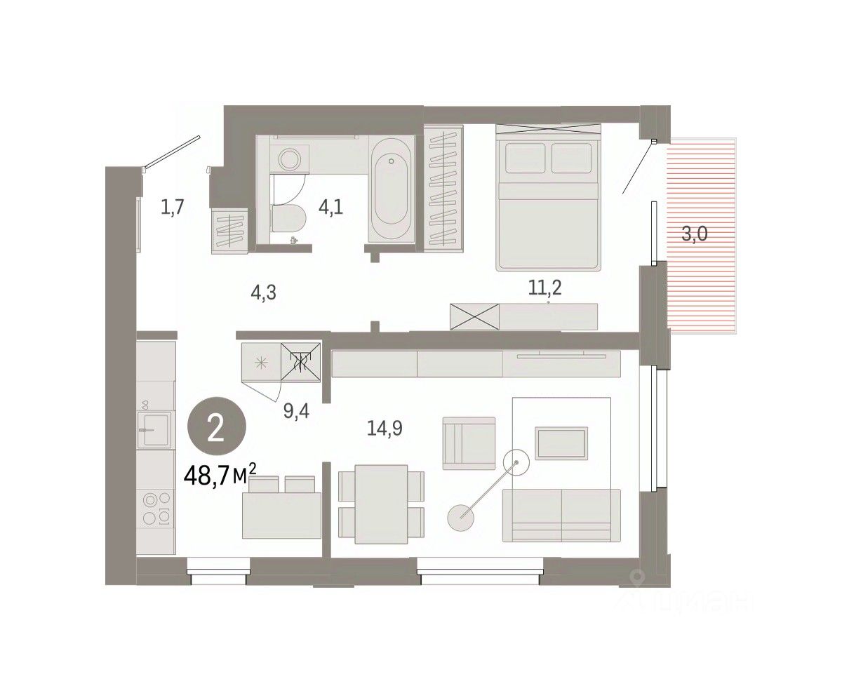 Квартира с кухней-гостиной и двумя спальнями в проекте Город-на-озере. Особенности планировки: балкон, вид во двор, потолки 3 м и выше, предчистовая отделка, разнесённые спальни. квартиры в нашей базе: ГРД01-Ж5.3.2.