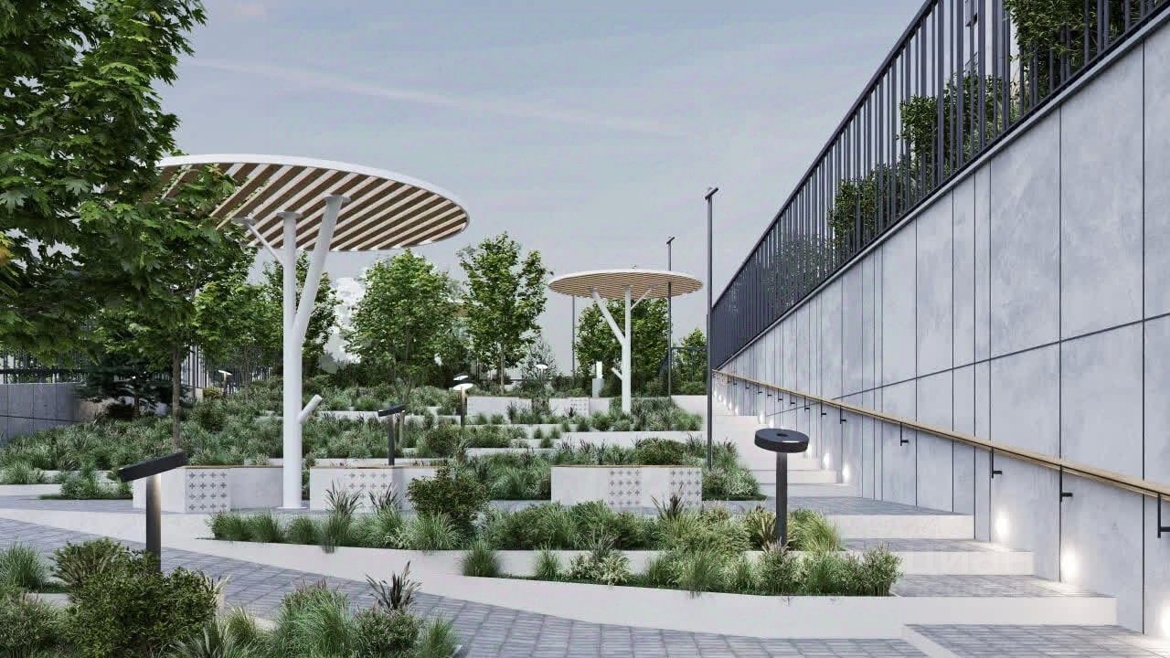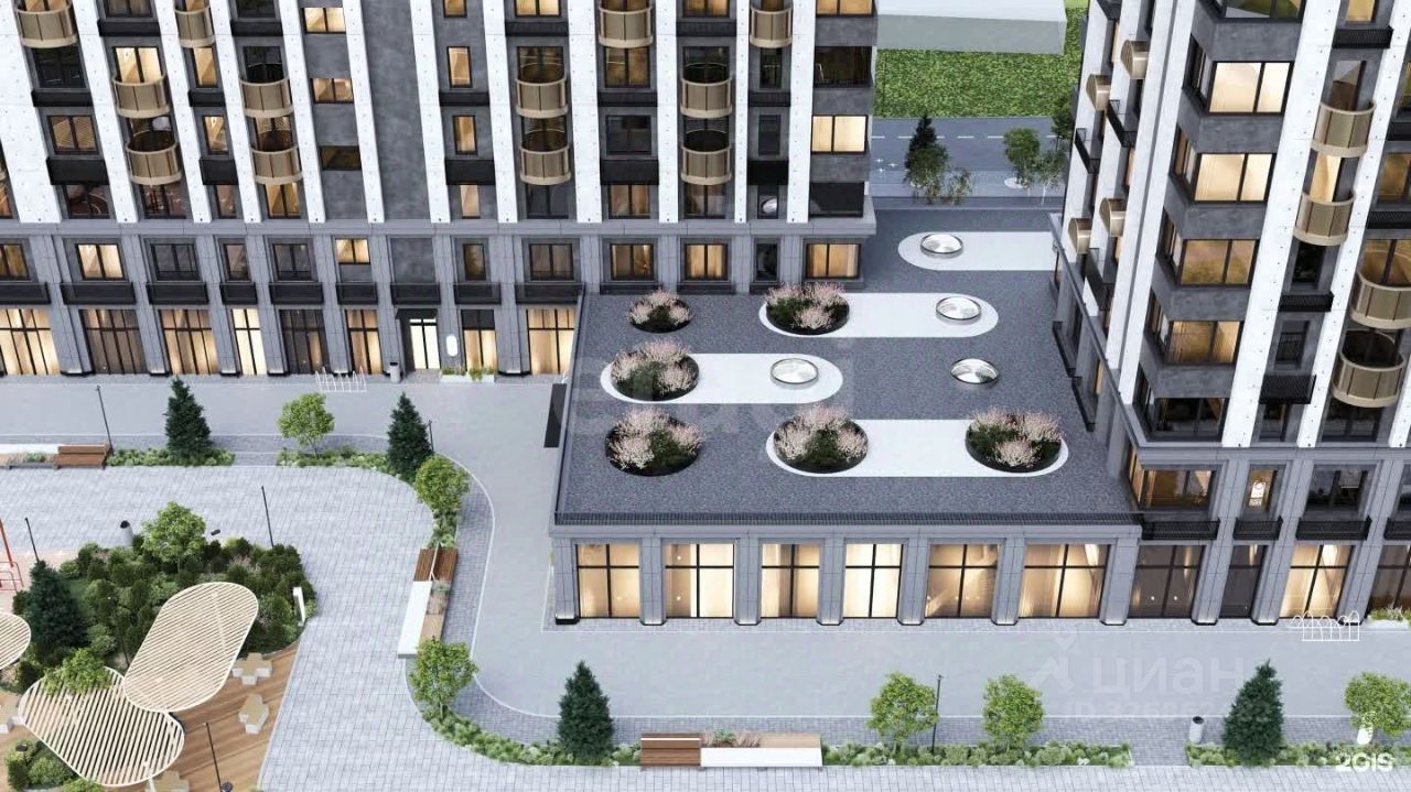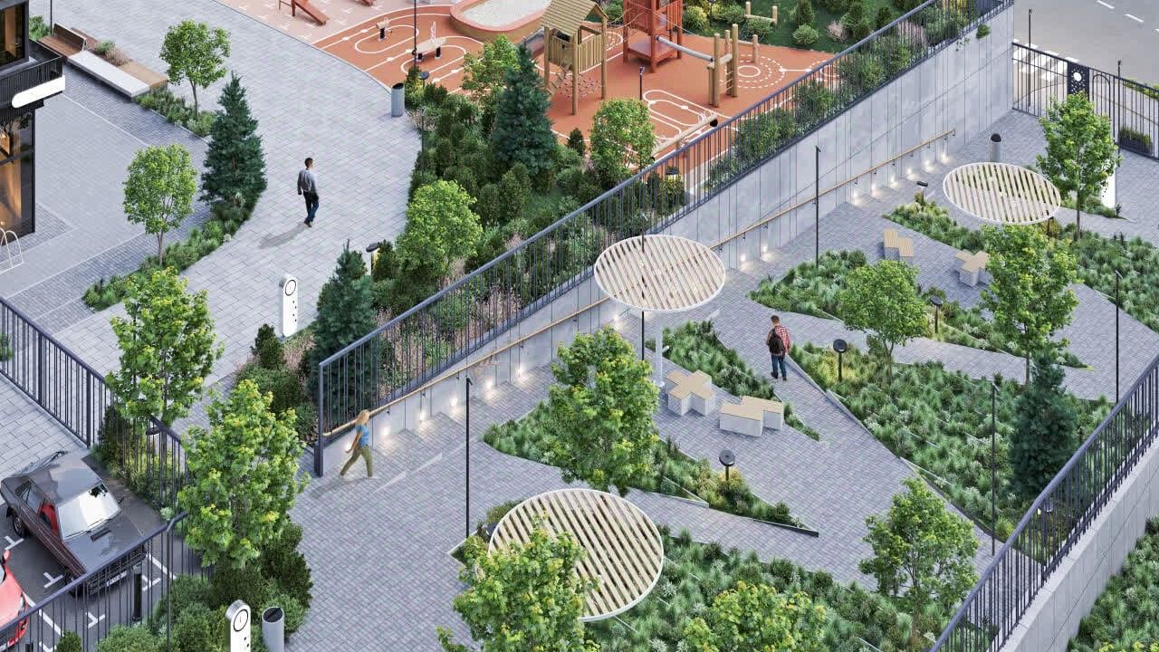 Территория комплекса закрытая и безопасная: видеонаблюдение, контроль доступа, подземный паркинг и кладовые. На стилобате — коммерческие помещения под магазины, кафе и сервисы, чтобы всё необходимое было ''под домом''. Во дворе — современные детские и спортивные площадки, зоны отдыха и прогулочные аллеи.