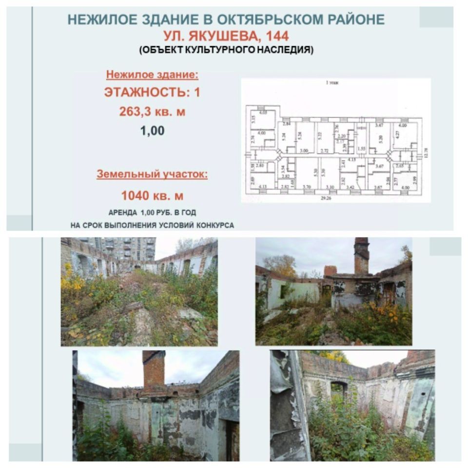 Нежилое одноэтажное здание ''Дом жилой комплекса сооружений станции ''Ново-Николаевск'' Алтайской железной дороги'', расположенный по адресу: Российская Федерация, Новосибирская область, город Новосибирск, Октябрьский район, ул. Якушева, 144. Площадь здания 263,3 кв. м. Земельный участок площадью 1040 кв. м