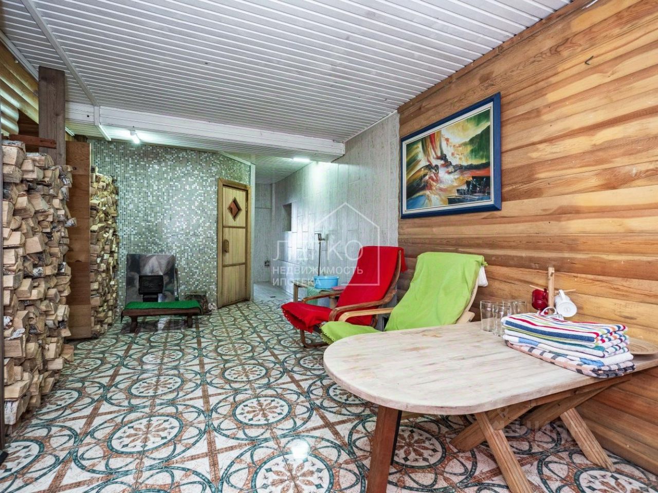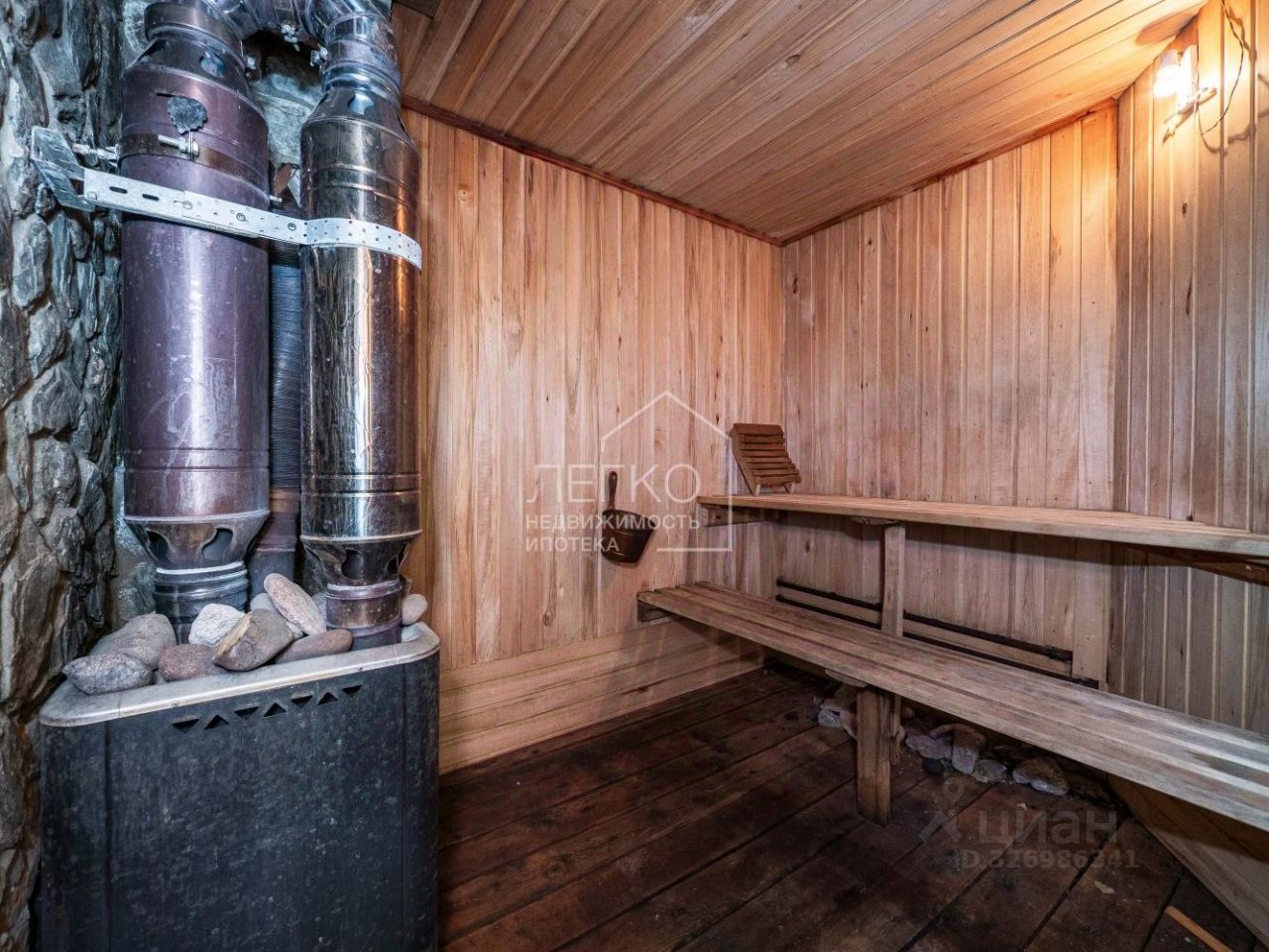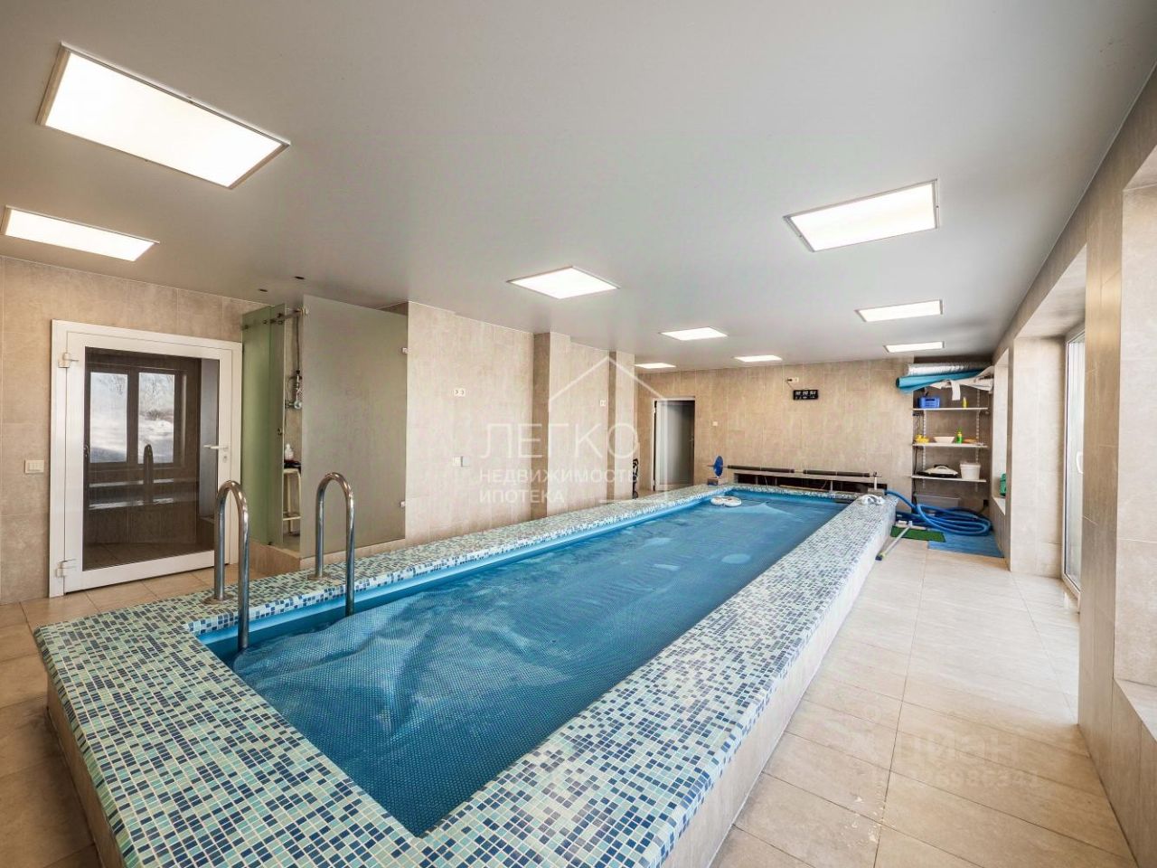 В цокольном этаже имеется финская сауна и подогреваемый семиметровый бассейн с противотоком и системой очистки