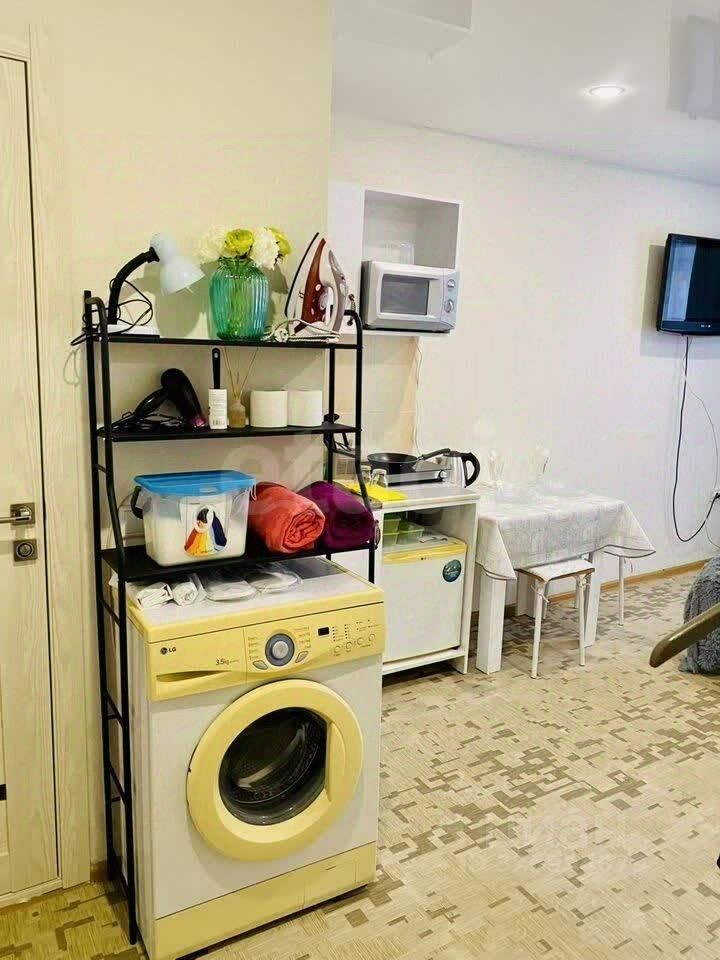 Внутри студии есть вся необходимая мебель: шкафы и диван. На кухне установлена современная варочная панель и стиральная машина. Из техники также имеется холодильник. В санузле совмещенный душ.