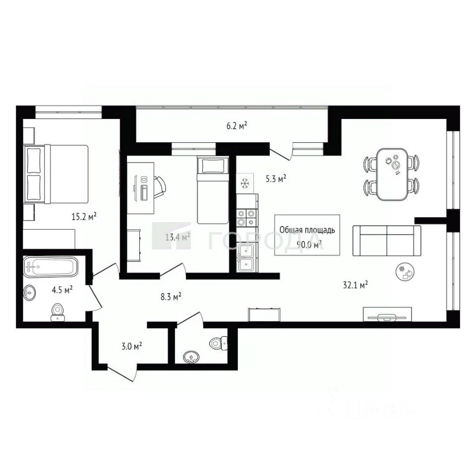 Квартира расположена на 7 этаже в 9-этажной урбан-вилле. Окна выходят на 2 стороны. Площадь 89,2 кв.м. Большая гостиная-кухня 37,4 кв. м., 2 спальни по 13,4 и 15,2 кв. м., 2 санузла. 2 большие лоджии.