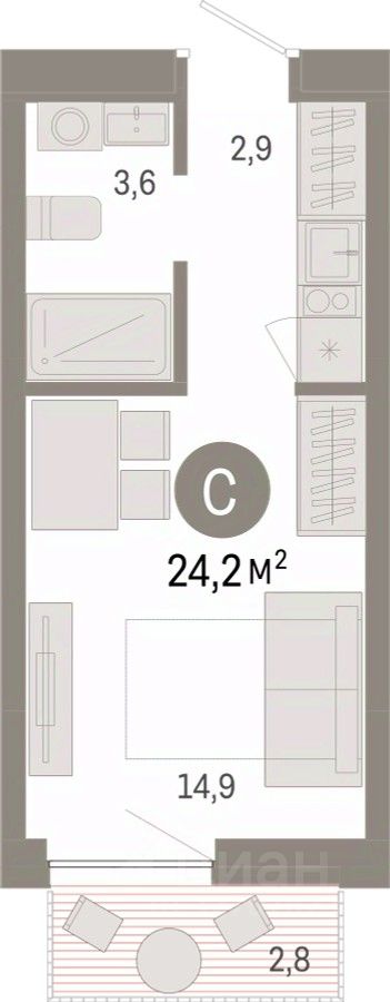 1-комн. студия от застройщика с предчистовой отделкой в Микрорайон ''Европейский Берег'' на 6 этаже. Общая площадь: 24.2 кв.м., площадь гостиной 14.9 кв.м., из которых 5 кв.м. выделено под кухонную зону. Все окна выходят на одну сторону. В квартире один балкон, один совмещенный санузел. Высота потолков 2.7 м.