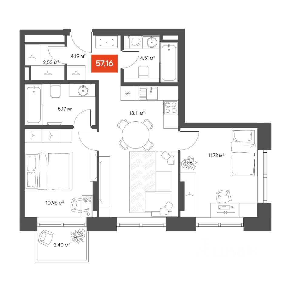 Общая площадь56,16 м2
