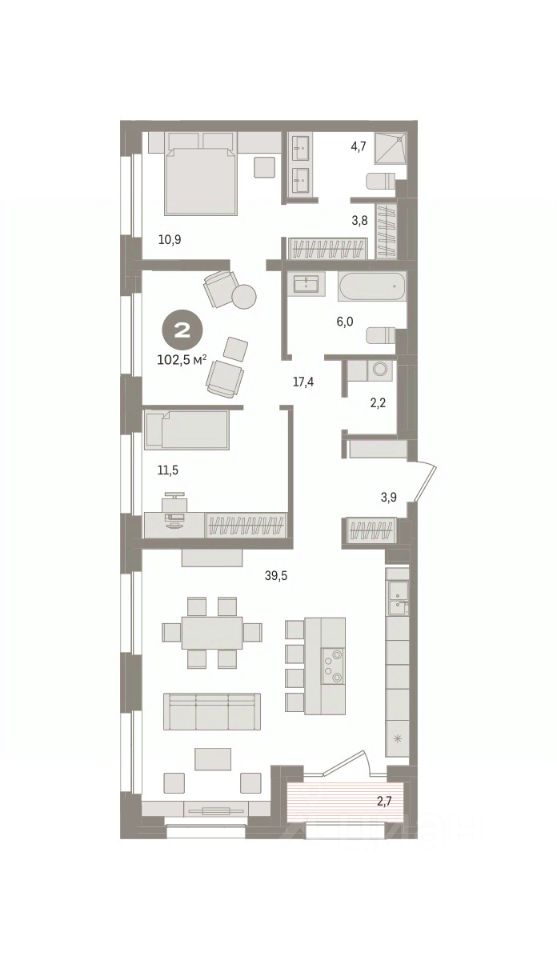 2-комн. квартира от застройщика с предчистовой отделкой в Квартал На Декабристов на 2 этаже. Общая площадь: 102.2 кв.м. Высота потолков 2.81 м.