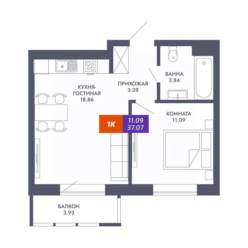 Общая площадь37,07 м2