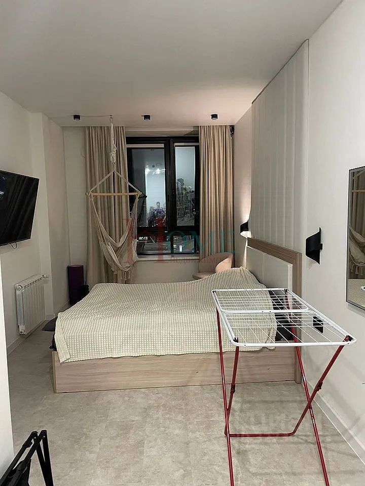 Идеально для пары или одного, кто ценит комфорт. Кухня-гостиная полностью оборудована: раскладной диван, стол со стульями, микроволновая печь и даже кронштейн под ТВ. Кухонного гарнитура нет, но готовы установить в счёт аренды. Вся техника в рабочем состоянии. Плюс шумоизоляция в комнате.