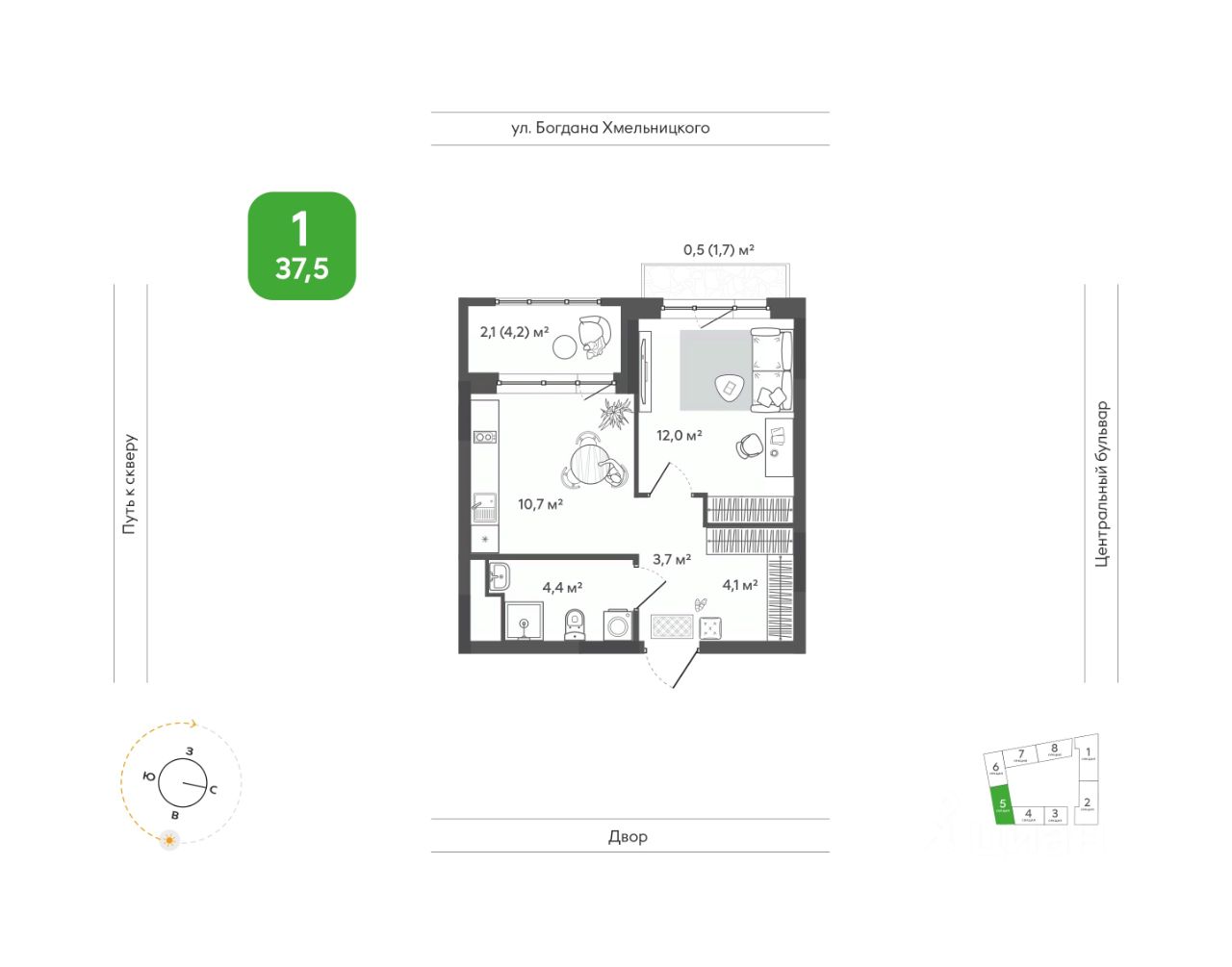 Продаётся 1-комнатная квартира в строящемся доме (Дом 1), срок сдачи: I-кв. 2028, общей площадью 37.5 кв.м., на 4 этаже. Жить в ритме природы, не теряя динамики города. В ''Сибирии'' свежий воздух встречается с динамикой города, создавая привилегию выбора: завтрак в кофейне на первом этаже дома или заряжающая пробежка в парке, культурный вечер в центре искусств или теплый семейный ужин на террасе. ''Сибирия'' становится частью нового городского кластера - с образовательной средой полного цикла, культурно-спортивным центром, медицинской инфраструктурой, современным центром искусств. Новые школы, детские сады, колледж с кампусом, новая поликлиника - все это делает жизнь комфортной и полноценной. ''Сибирия'' - это дом, где город открывает дверь в природу, а природа впускает в себя комфорт мегаполиса.