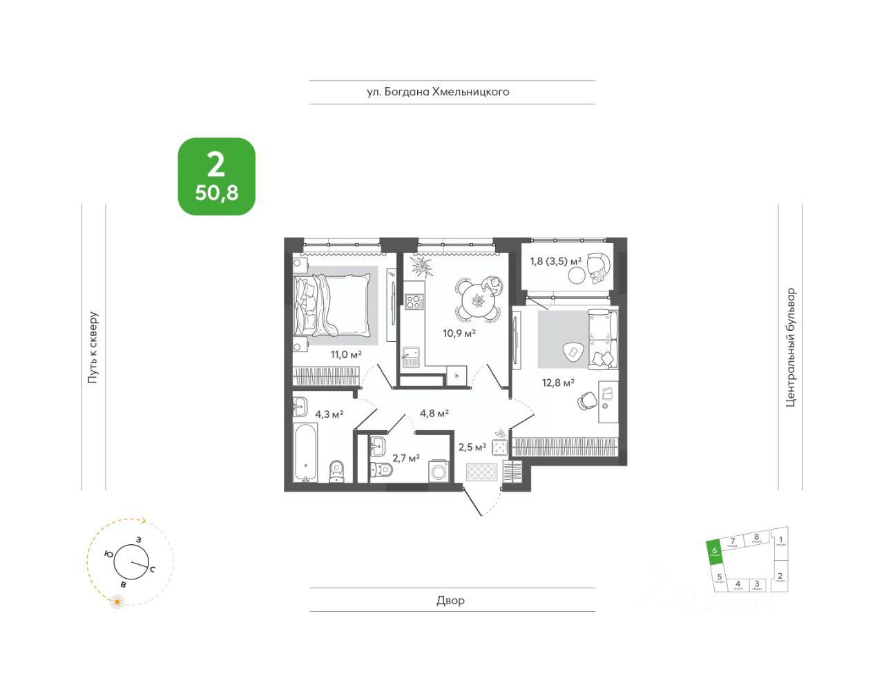 Продаётся 2-комнатная квартира в строящемся доме (Дом 1), срок сдачи: I-кв. 2028, общей площадью 50.8 кв.м., на 9 этаже. Жить в ритме природы, не теряя динамики города. В ''Сибирии'' свежий воздух встречается с динамикой города, создавая привилегию выбора: завтрак в кофейне на первом этаже дома или заряжающая пробежка в парке, культурный вечер в центре искусств или теплый семейный ужин на террасе. ''Сибирия'' становится частью нового городского кластера - с образовательной средой полного цикла, культурно-спортивным центром, медицинской инфраструктурой, современным центром искусств. Новые школы, детские сады, колледж с кампусом, новая поликлиника - все это делает жизнь комфортной и полноценной.