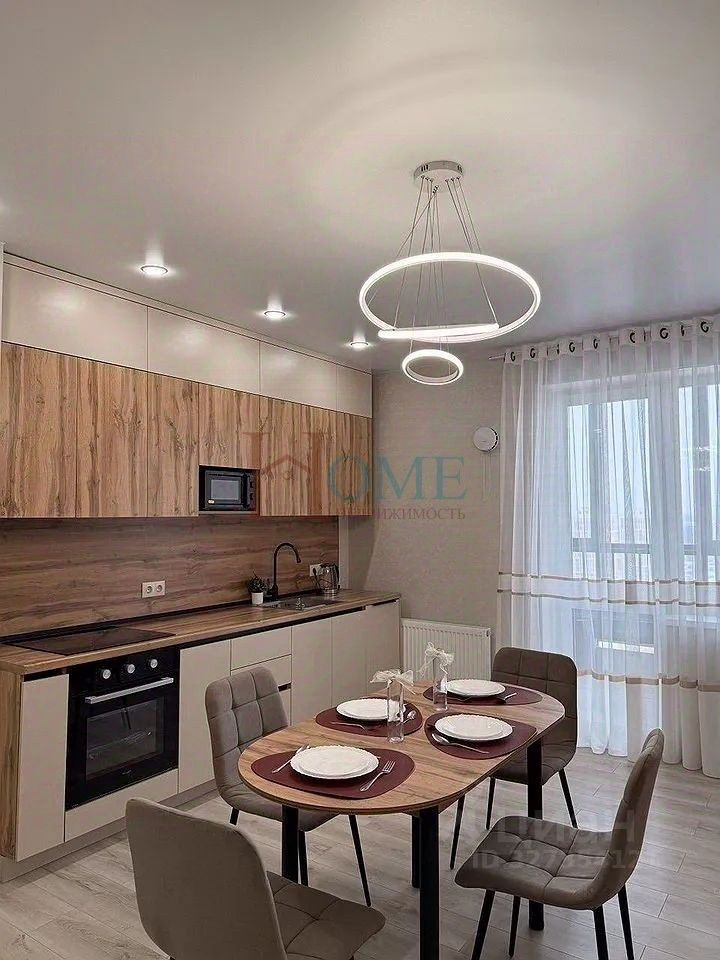 Кухня оснащена всей необходимой техникой, включая холодильник, плиту и микроволновку.